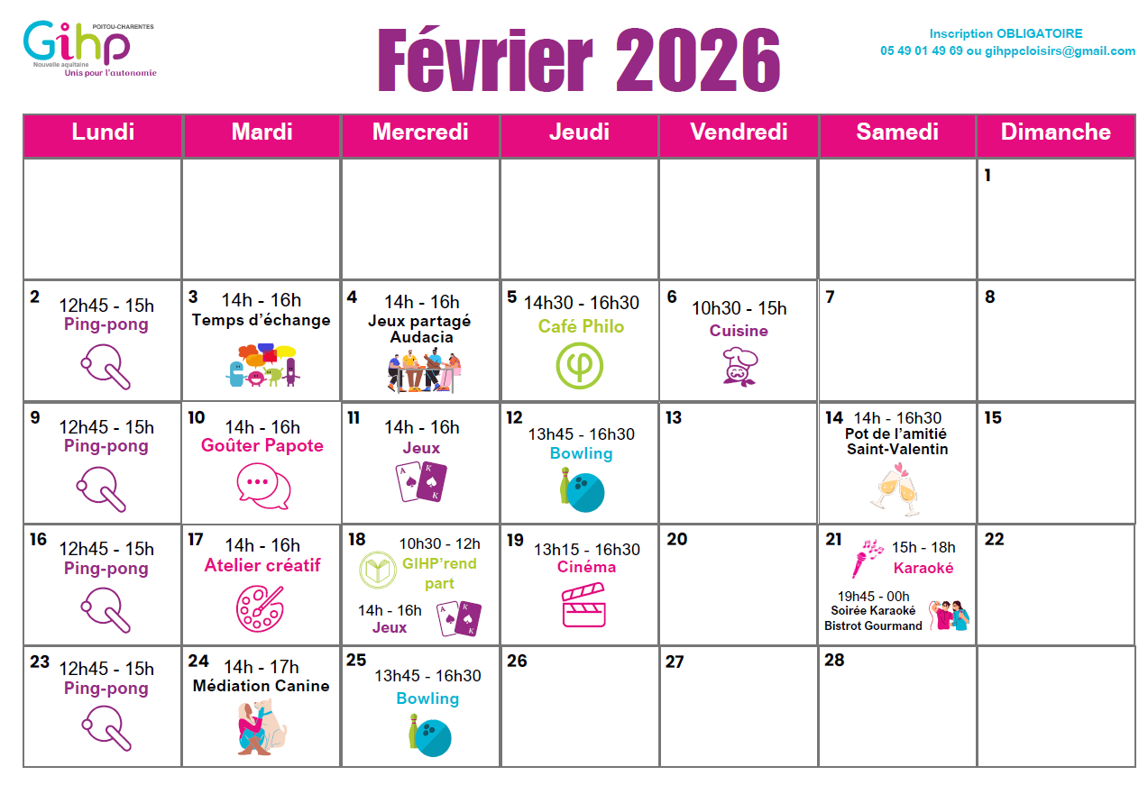 Chaque mois, le GIHP propose plusieurs temps de rencontre et de loisirs ouverts à ses adhérents, favorisant les échanges, la convivialité et le bien-être.