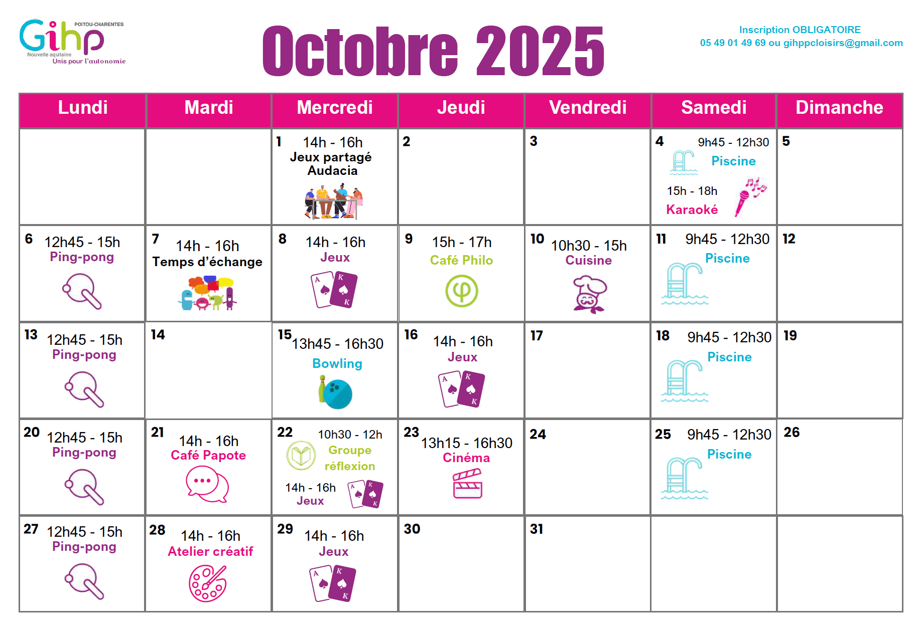 Inscription obligatoire : 05 49 01 49 69 ou gihppcloisirs@gmail.com